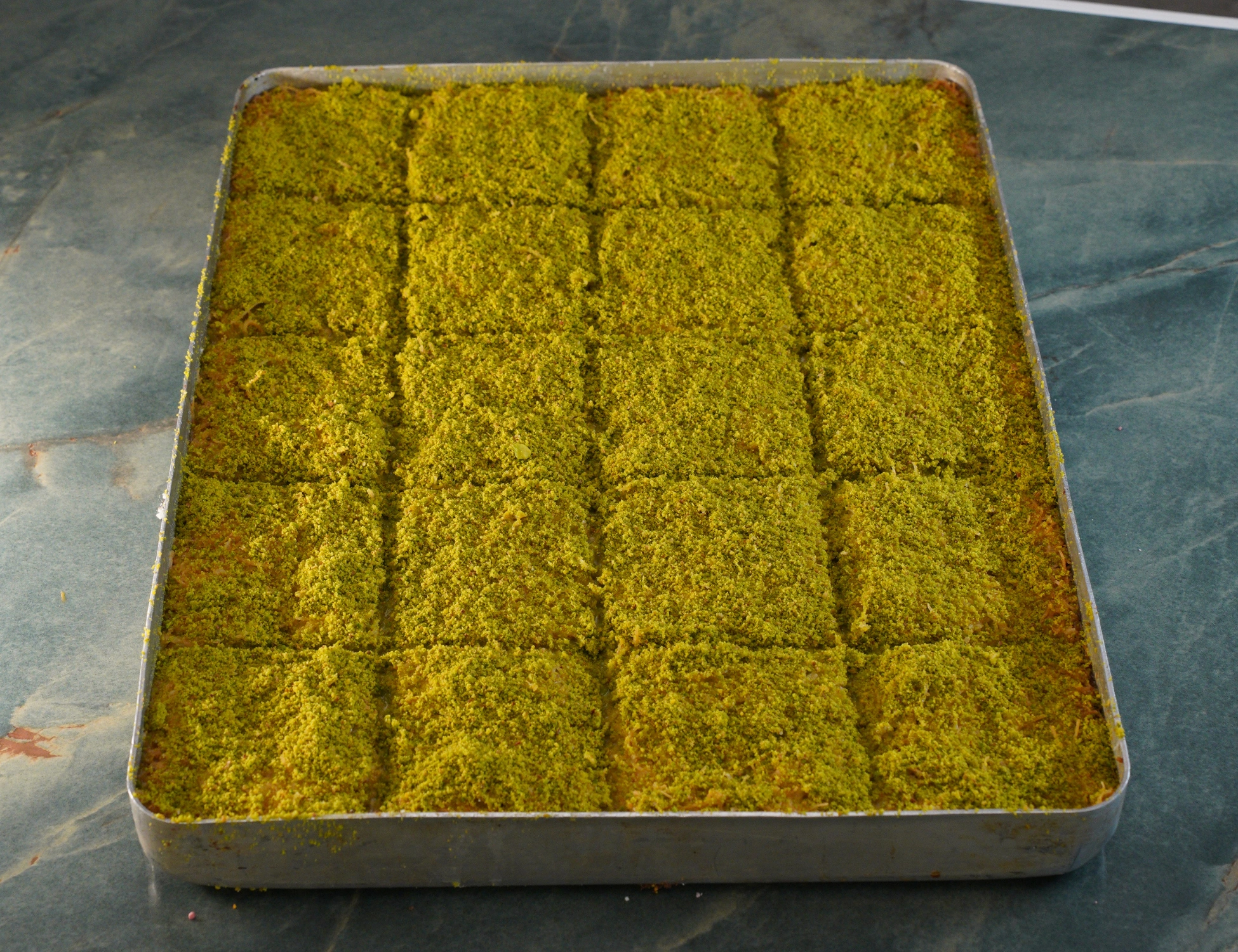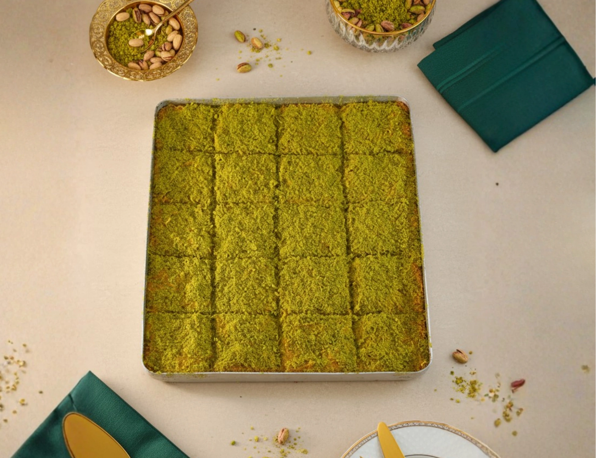 Kadayıf teli, sade yağ, pancar şekeri, 1. sınıf Gaziantep boz fıstığı, süt şerbeti, çikolata, su, limon suyu, tuz.