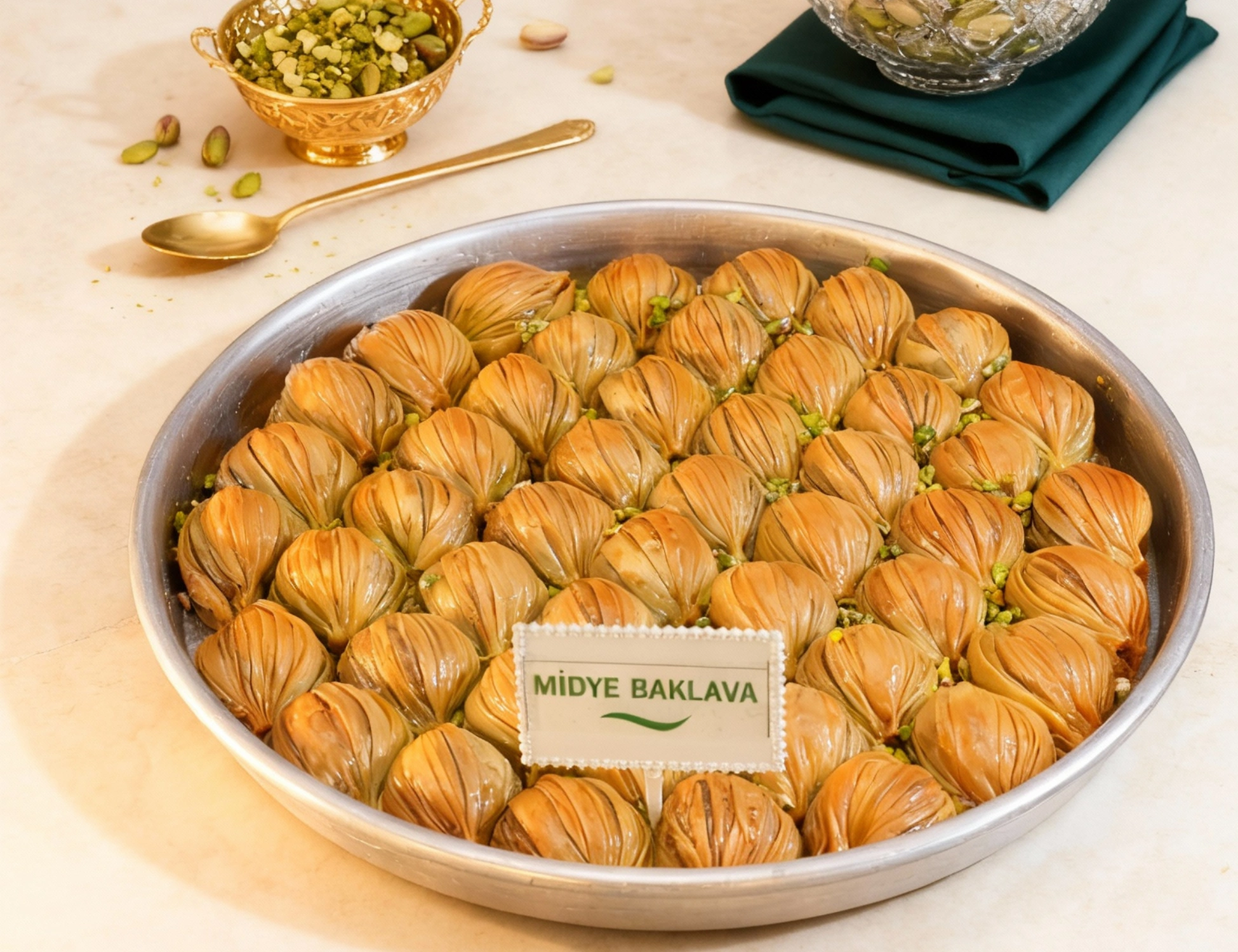 İncecik açılmış el yapımı yufkaların arasına serpiştirilen 1. sınıf Gaziantep boz fıstığı ve eritilmiş gerçek sade yağın uyumuyla hazırlanır. Her bir parça, adını şeklinden alan midye formuyla altın rengine kavuşana kadar taş fırında pişirilir. Üzerine dökülen doğal pancar şekeri şerbeti, kıvamı ve parlaklığıyla lezzeti mükemmel şekilde tamamlar.